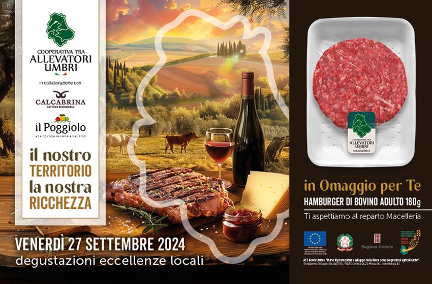 La Cooperativa tra Allevatori Umbri ti invita venerdì 27 settembre presso i punti vendita Conad, Conad City, Conad Superstore e Spazio Conad dell’Umbria al grande evento in collaborazione con la Cantina Calcabrina e l'azienda agricola il Poggiolo con degustazione delle nostre eccellenze locali. Ti aspettiamo presso il reparto macelleria, in OMAGGIO per te un hamburger di bovino adulto.