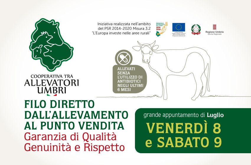 La Cooperativa Allevatori Umbri ti invita VENERDÌ 8 e SABATO 9 LUGLIO a conoscere le Carni ottenute secondo il Disciplinare, presso i punti vendita Conad, Conad City, Conad Superstore e Spazio Conad dell’Umbria che aderiscono all’iniziativa.